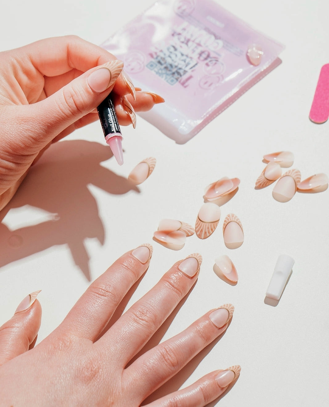 If you lose a nail don't panic — buff off any nail glue and reapply using the same steps fromour signature application method.
