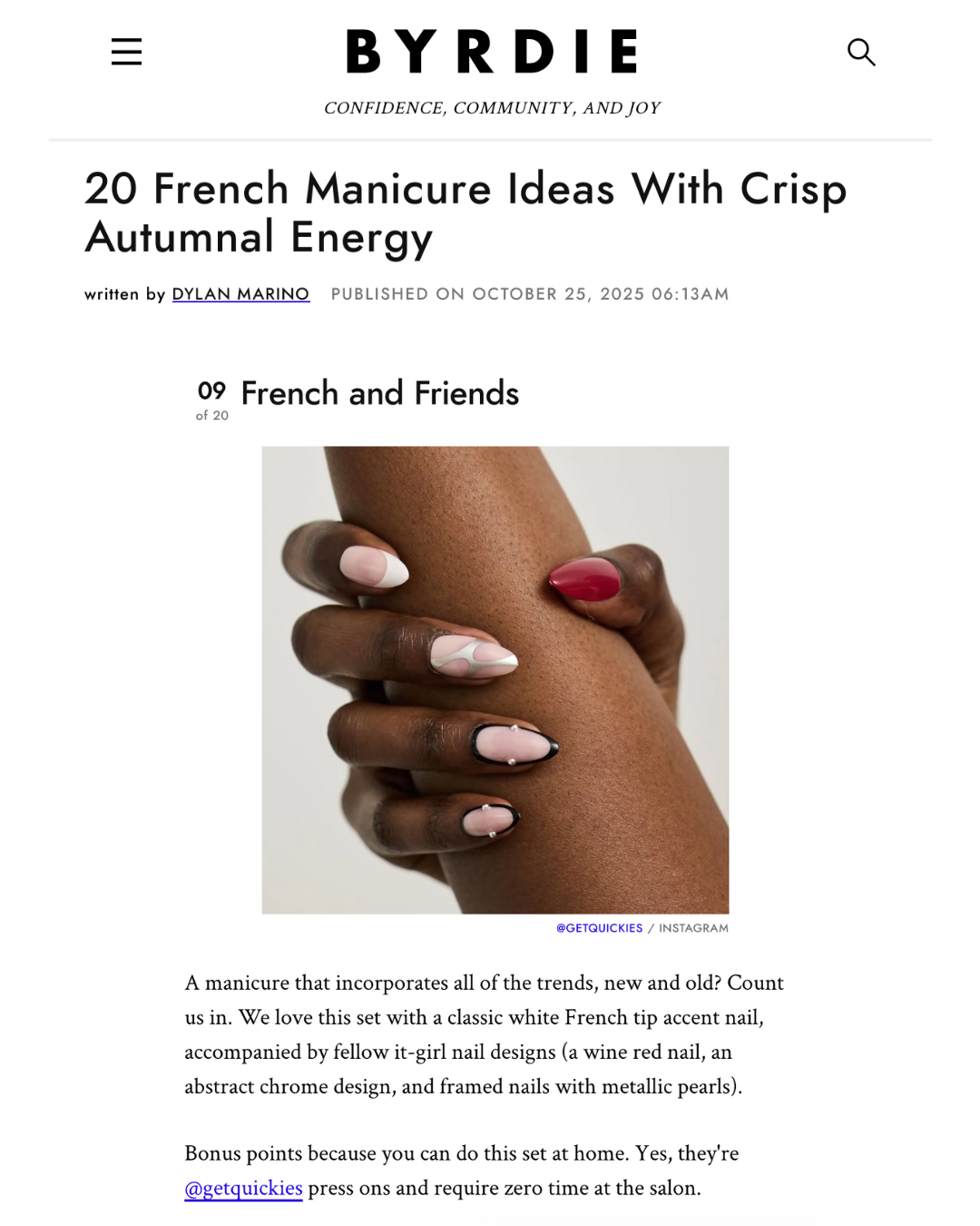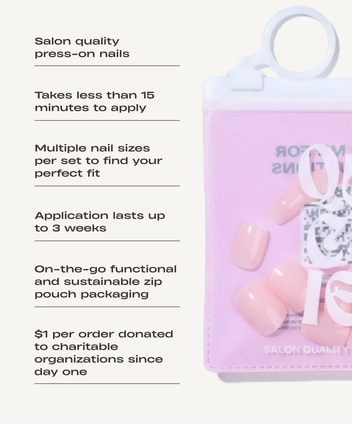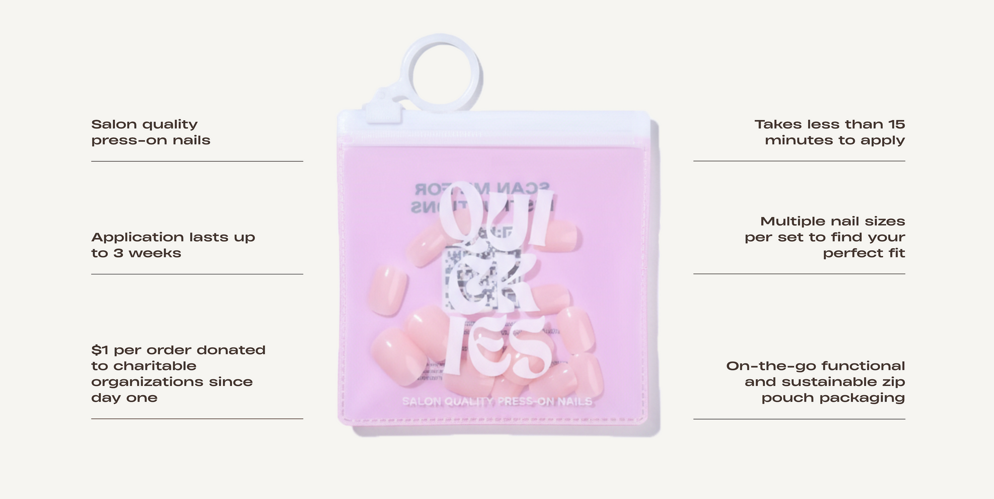 Meet Quickies—salon quality press-on nails that save you time and money with a manicure you can do anywhere, anytime. We design press-ons for girls, gays, and theys who want instant satisfaction without the baggage. Quickies is proudly Canadian and the first press-on nail brand to feature truly inclusive models, from non-binary icons to 97-year-olds divas, because we believe everyone deserves a quickie. Did we mention we don’t erase age spots, veins, anxiety cuticles, or any of those real life details? Quickies has also reinvented the press-on experience itself, ditching messy cardboard boxes and wasteful plastic trays for our functional, on-the-go zip pouch made from 100% recyclable plastic. And because looking good should do good, we’ve been charitable since day one with $1 from every order donated to charitable initiatives. Quickies is committed to solving all the pain points of expensive and timely manicures by giving you the convenience of a manicure on the go that will leave everyone asking "where did you get your nails done?"... go ahead, Quick and tell.