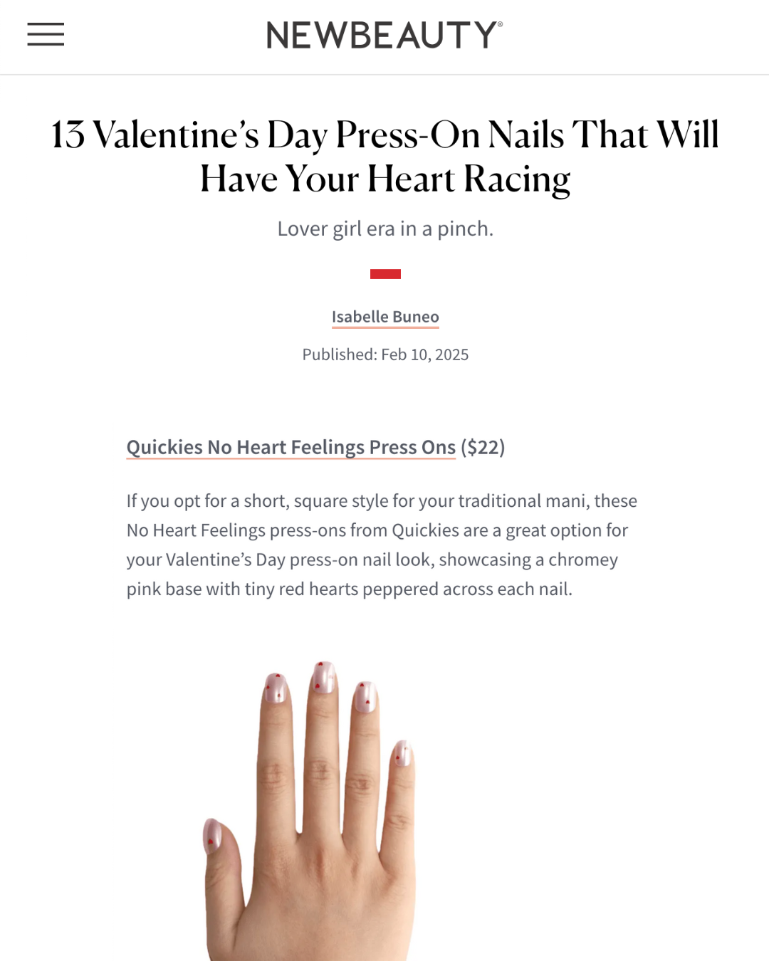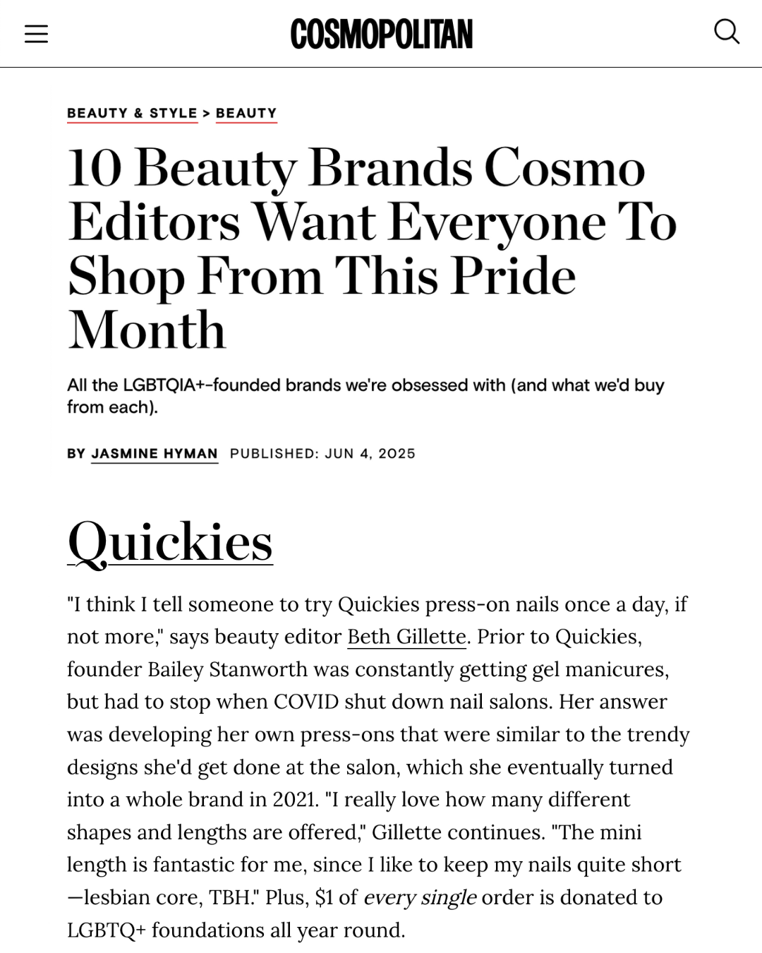Hi, my name's Bailey and I'm a nail biter. I've struggled with short painful nails and anxiety cuticles for years (cute, I know) — which is why I understand the true impact a manicure can make. I founded Quickies on the mission to give girls, gays and theys back their precious time, hard earned money and much deserved confidence. I know press-ons aren't changing the world but I hope that Quickies can help make your day-to-day life a little easier so you have more time for the things that matter.